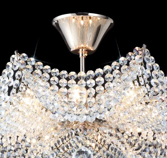The Delta Crystal Ceiling Light has a luxury design suitable for both classic and contemporary interiors. The ceiling mount crystal light is created by a combination of staggered gold panel structure supporting cascading striking sculpted crystal drops The high-quality crystal shine elegantly and create a grandeur ambiance.