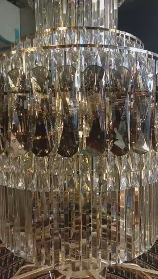 Add a touch of grandeur to your space with the Massalia Double Height Chandelier. This exquisite chandelier, crafted from smoke gray crystal and adorned with clear crystal drops, embodies luxury and sophistication, making it the perfect statement piece for your home.