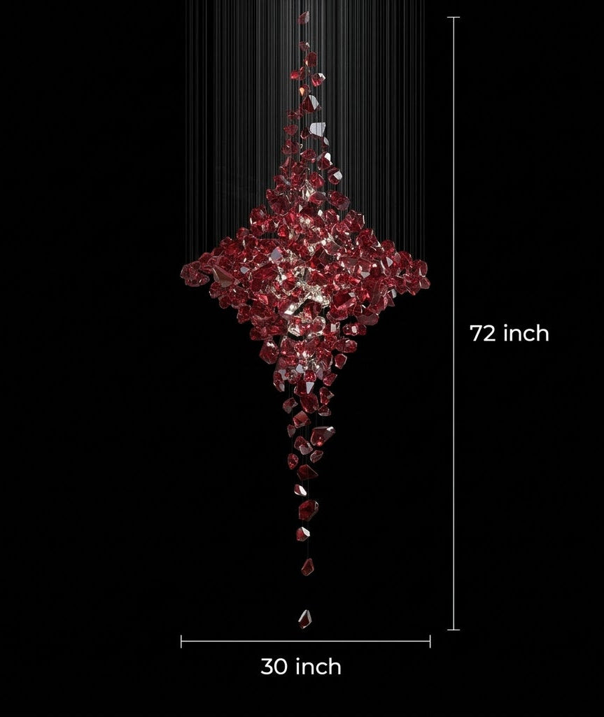 A ruby-red crystalline Double Height Chandelier, like a suspended gemstone, provides a sharp, contemporary contrast to the neutral walls. Crafted specifically to enhance high-ceilinged spaces, this chandelier is perfect for luxury staircases, villas, double-ceiling heights, and grand lobbies, creating a breathtaking focal point.