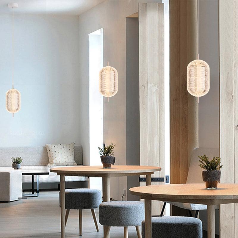 Design: Cylindrical pendant with fine crystal mesh detail.