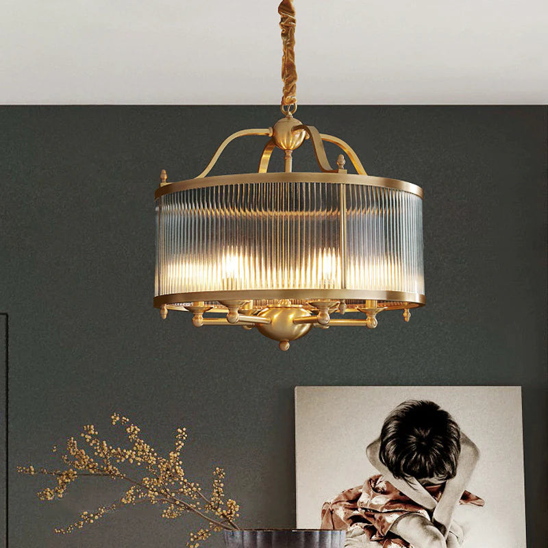 Add timeless elegance to your space with this Gold Finish Crystal Glass Drum Chandelier, a perfect blend of classic charm and modern sophistication. The fixture features a cylindrical drum design with vertical ribbed crystal glass panels that beautifully diffuse the light, creating a warm and inviting glow.