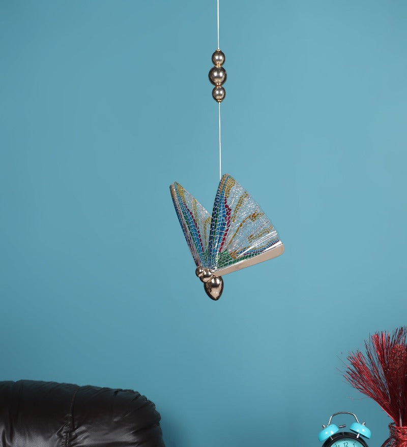 SINGLE MULTI COLOUR BUTTERFLY HANGING PENDENT IN GOLD FINISH WITH IN BUILT LED.