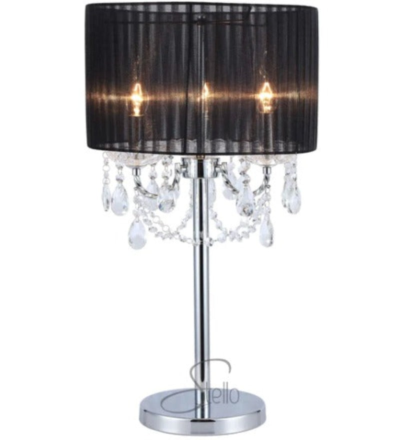 Classic chrome finish Table lamp which will induce elegance and charm to your home interiors with its vintage design and transitional appeal. The Sparkler Table lamp design features streamlined upright arms in rich Chrome finish with a crystal ball, beautifully complemented with soft black fabric shades This Sparkler Table lamp offers warm ambient lighting and is perfect for adding sophisticated lighting to your living room, bedside table or console table. It will add unparalleled grace and elegance to your home decor. This opulent and elegant Table lamp will enhance your interior decor and make a mesmerizing statement.